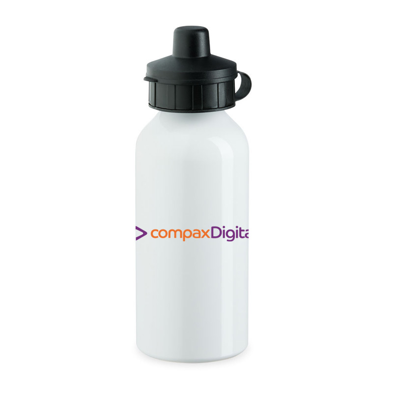 Bedruckbare Aluminium Trinkflasche mit zwei verschiedenen Verschlussmöglichkeiten. Dabei sind ein Mundstück zum Hochziehen mit Deckel und ein Schraubverschluss mit Karabinerhaken.